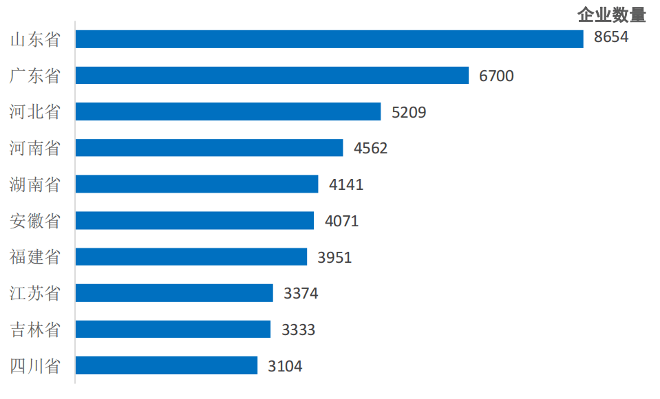 数据显示,截至2022年12月29日,我国现有预制菜相关企业7。59万家。2011-2020年,预制菜企业注册数量逐年递增。此中,2020年预制菜相关企业增加势头最猛,新增企业注册数量达1。29万家。 图2-3 2013-2022中国预制菜相关企业注册量 (图表数据来自迈点研究院《2022年中国预制菜财产成长演讲》和艾媒征询《2022年中国预制菜财产成长》)从企业分布的环境来看,目前我国预制菜企业次要集平分布正在山东、广东、江苏等具有生态资本劣势的东部沿海地域以及河南、安徽等保守农业大省。截至2022年12月31日,山东具有预制菜相关企业位居全国第一,达8000余家,占比11。4%。其次是广东,约6700家预制菜相关企业。